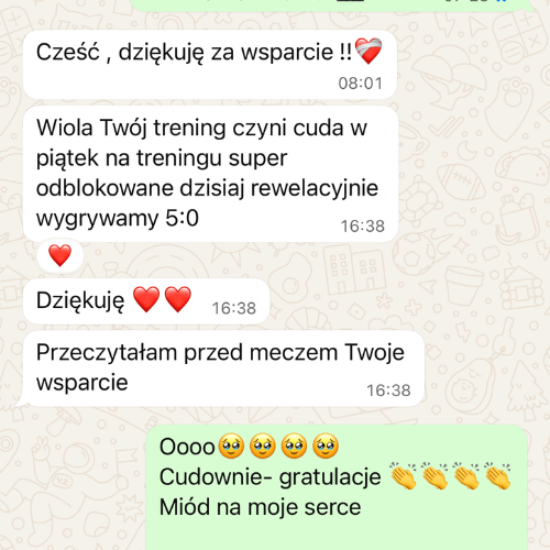 I to pięknie pokazuje esencję treningu mentalnego. Rozpoznajesz i nazywasz swoje myśli, przekonania i emocje. Uczysz się, gdzie i jak się je czuje. A ja jestem obok – wspieram, sprawdzam, pokazuję, jak samodzielnie zarządzać swoimi myślami i emocjami. Żebyś dać Ci wiedzę i narzędzia, jak świadomie nimi zarządzać. Dostajesz techniki, które pomagają Ci “obsługiwać” emocje i uczysz się zaplanowanej, świadomej pracy nad zmianą myśli i przekonań.